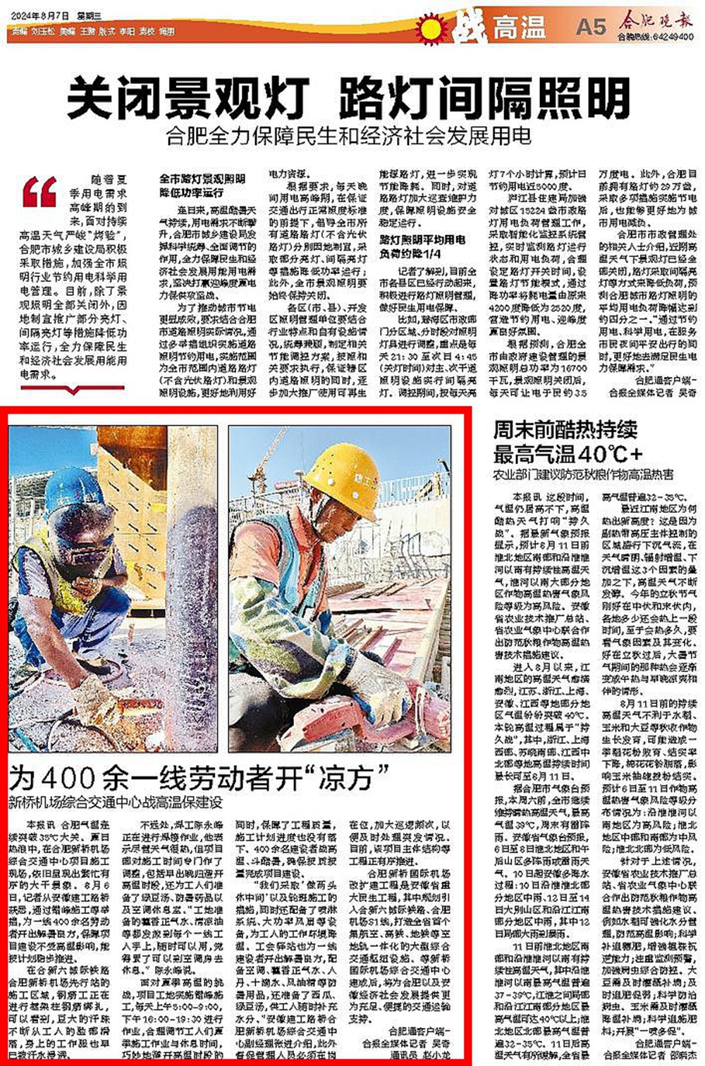 近日合肥氣溫連續(xù)突破35℃大關(guān)。安徽新聞聯(lián)播、安徽日報、合肥晚報等多家省市主流媒體深入報道安徽建工路橋合肥新橋國際機場綜合交通中心項目戰(zhàn)高溫、保生產(chǎn)。項目開出解暑良方,采取錯時施工、在作業(yè)區(qū)增設(shè)工業(yè)風扇等措施,保障高溫天氣下勞動者生命安全和身體健康,確保這一重點工程建設(shè)的生產(chǎn)進度,保障項目建設(shè)不受高溫影響穩(wěn)步推進。
